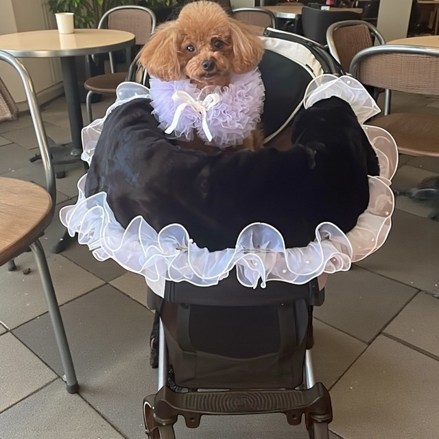 中綿入りペットカート用あご乗せファーマット 黒ファー×白&白フリル