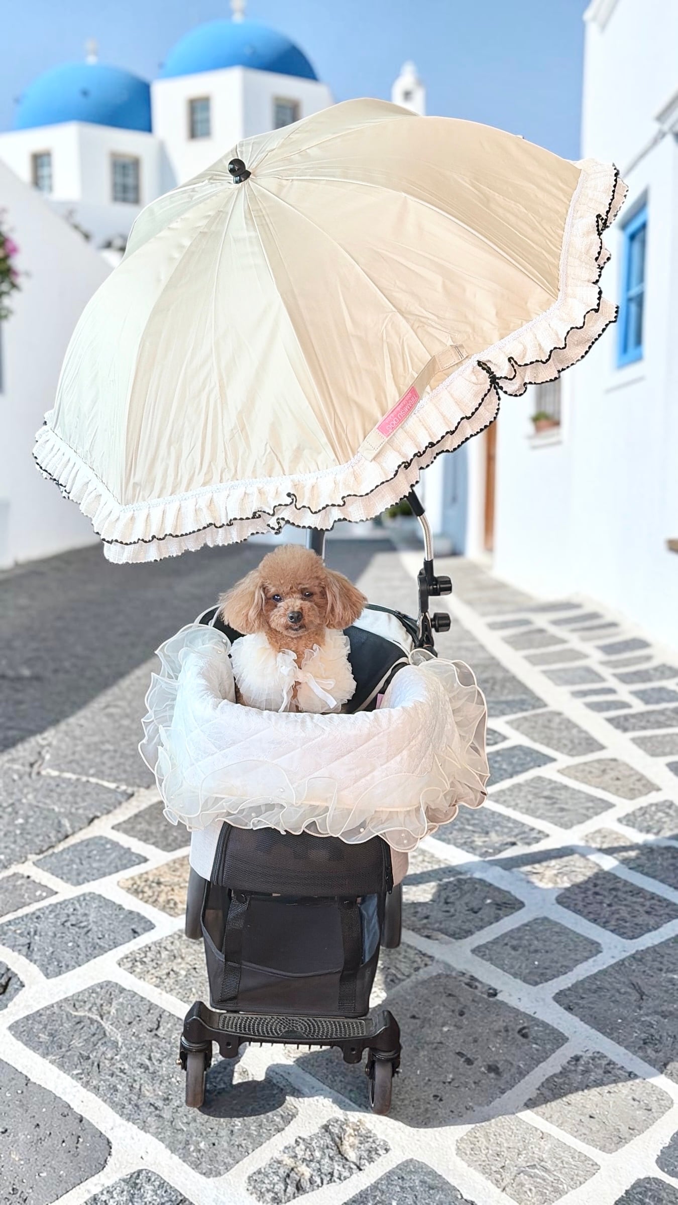バギーパラソルTIRASOL(ティラソル)はどんなペットカートにも取り付け可能な専用金具付きのSPF50+バギーパラソルです。ワンちゃんの目は紫外線に弱いと言われており、目の病気を発症するリスクを高めない為にも紫外線対策は大切です。
