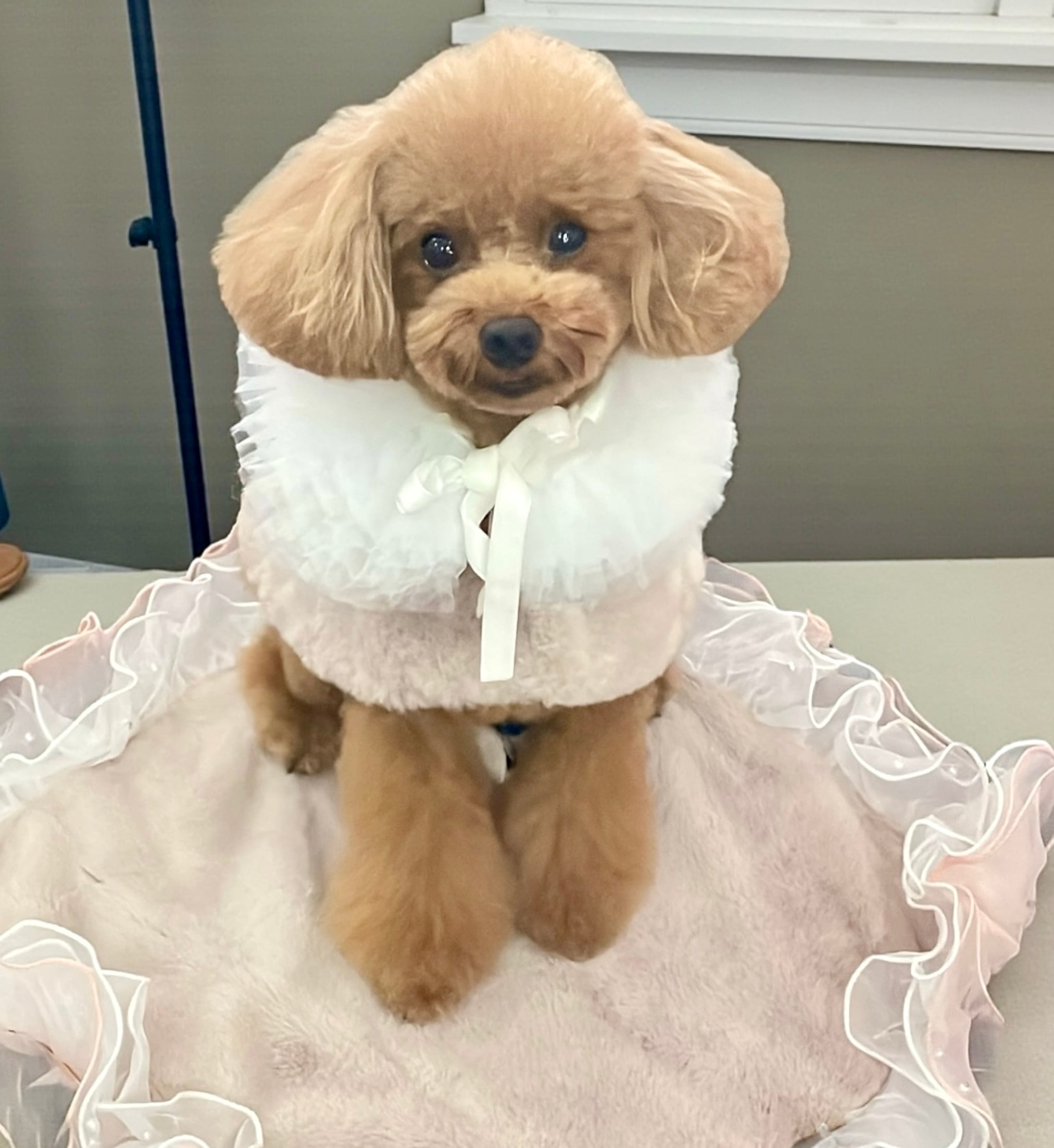 (チュールフリルの性質上ボリュームが出るので、小さめワンちゃんだとボリュームがありすぎる場合がございます。小さめワンちゃんの場合、別ページのファーマフラーの方がオススメです。)