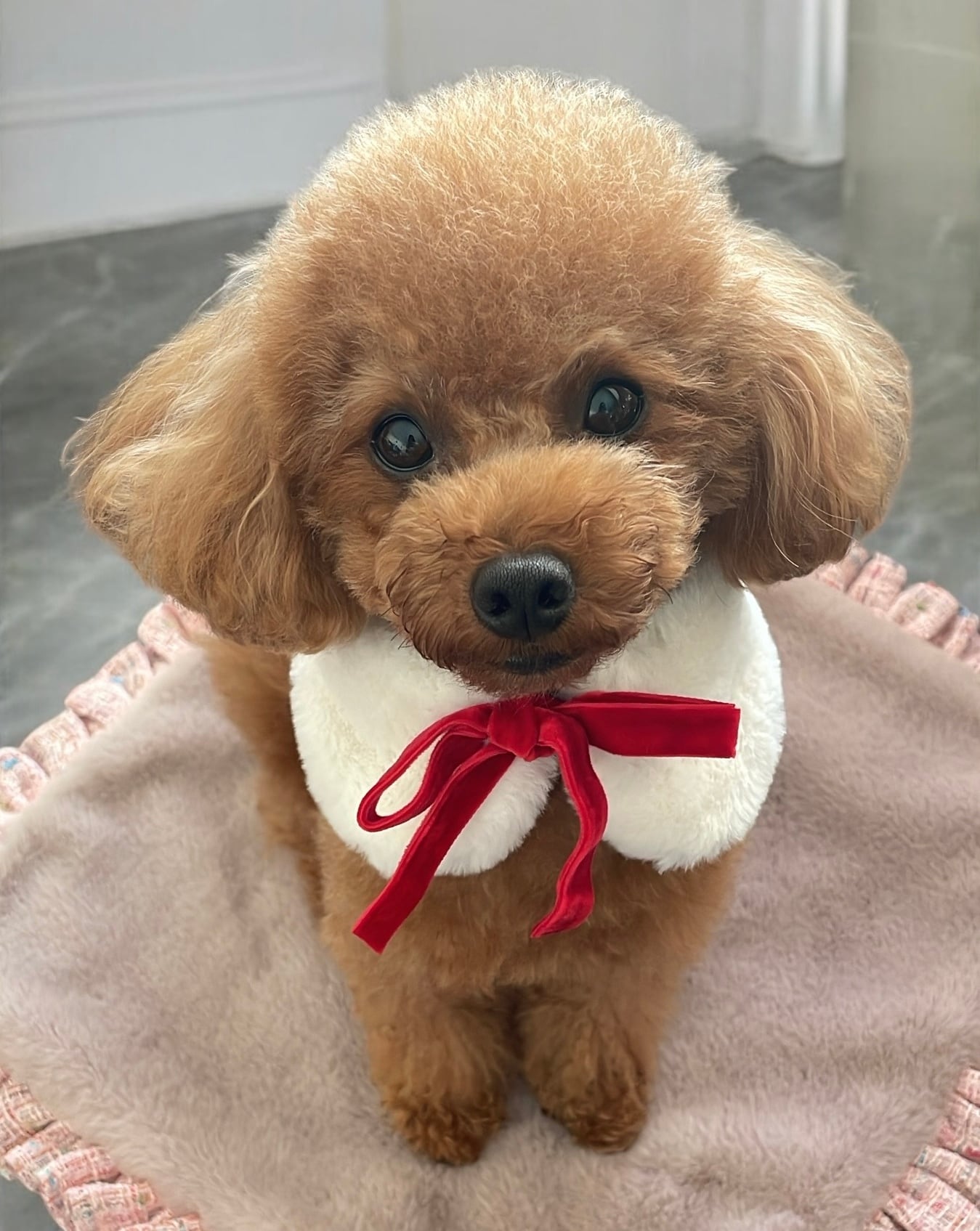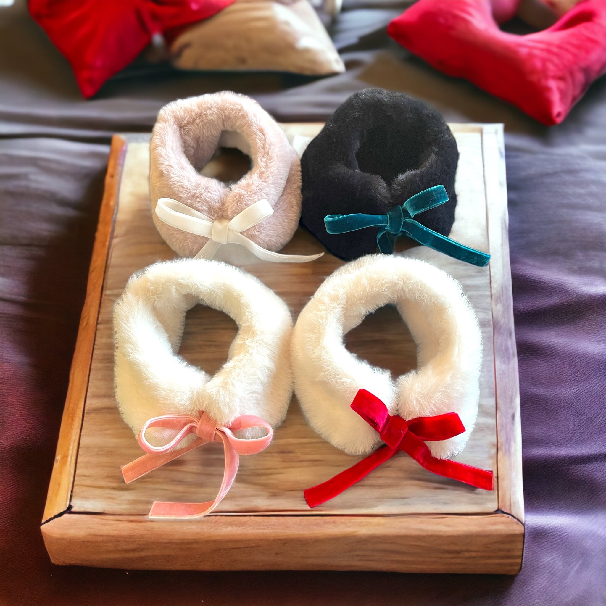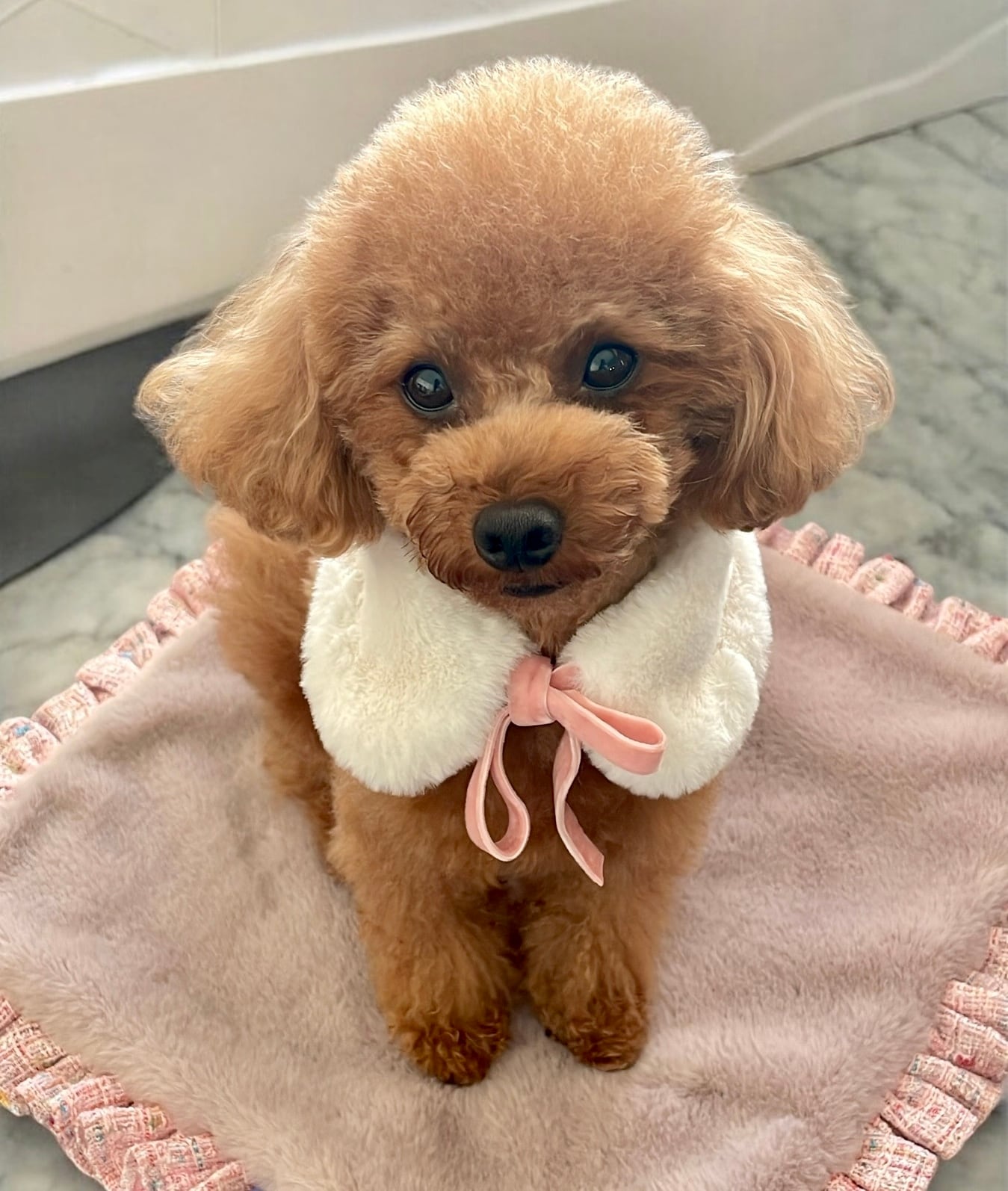 フワフワのマフラーです。リボンで結ぶタイプなのでサイズの調整ができます。同じファーを使用したお散歩バッグもございますのでオーナー様とのリンクコーデも楽しめます。