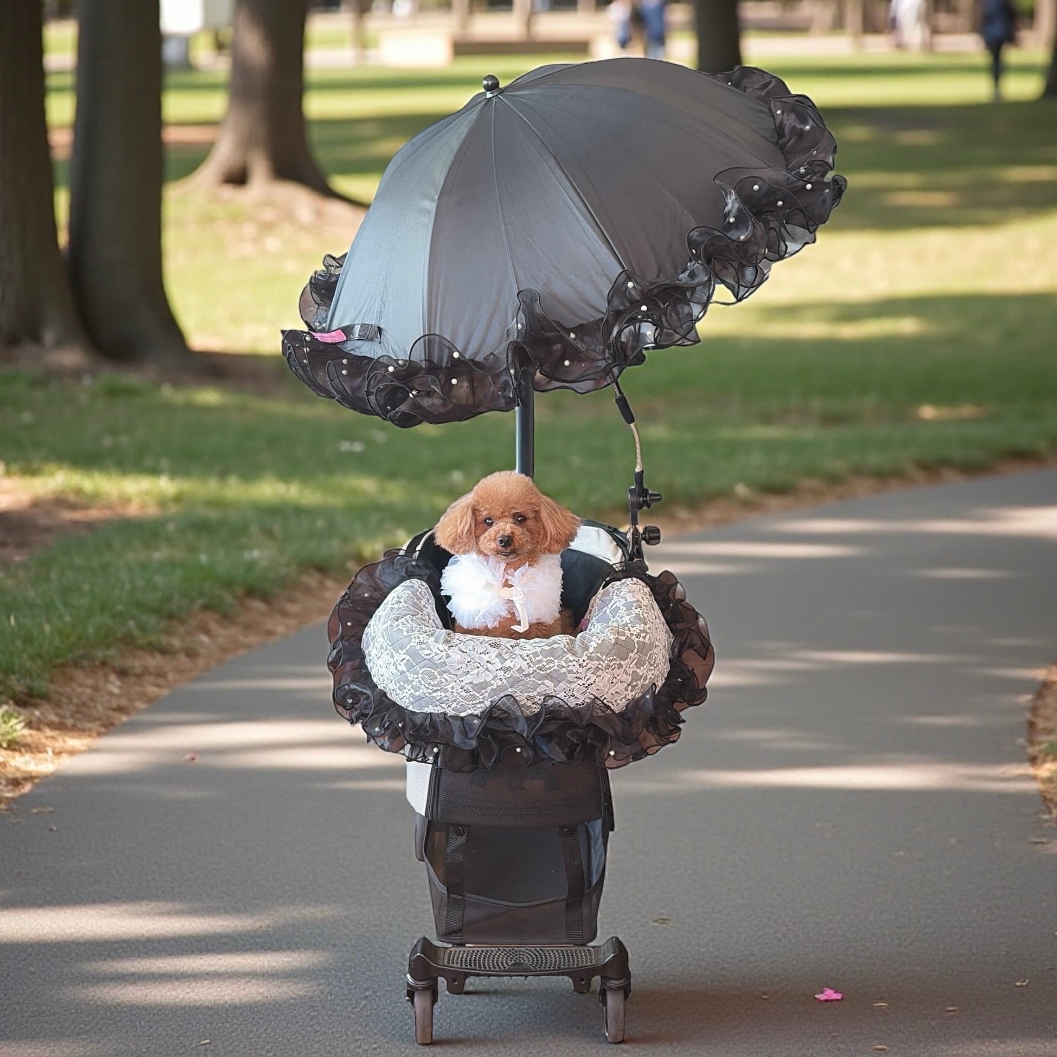 バギーパラソルTIRASOL(ティラソル)はどんなペットカートにも取り付け可能な専用金具付きのSPF50+バギーパラソルです。ワンちゃんの目は紫外線に弱いと言われており、目の病気を発症するリスクを高めない為にも紫外線対策は大切です。
